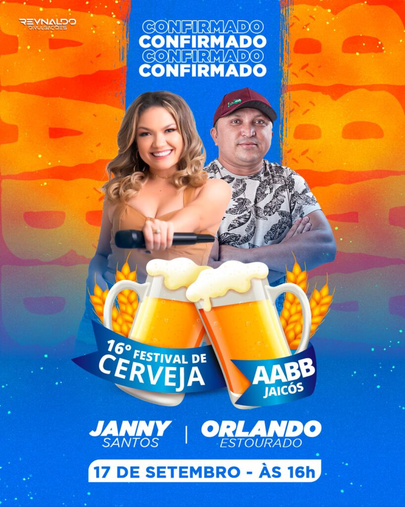A diretoria anunciou que o 16º Festival de Cerveja da AABB acontecerá no dia 17 de setembro, um domingo, a partir das 16h, no clube da AABB de Jaicós. Com 3 horas de open bar liberado, as atrações confirmadas são o cantor sucesso do momento em Jaicós, Orlando Estourado e a cantora Janny Santos.