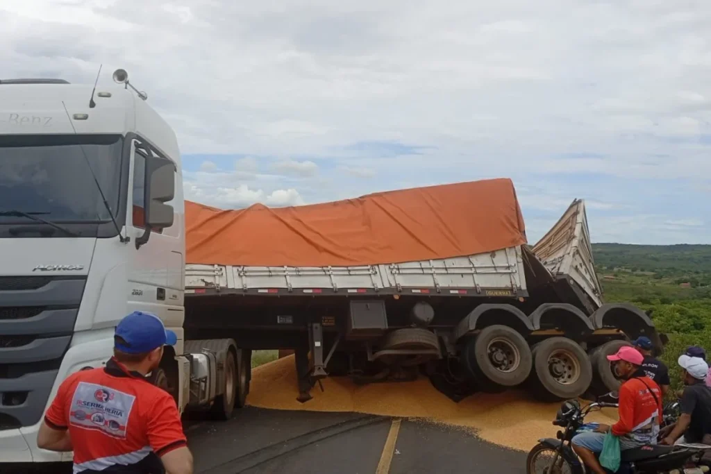Uma carreta carregada de milho tombou parcialmente por volta do meio-dia desta segunda-feira (20) em um trecho da rodovia estadual PI-245, no trecho que liga as cidades de Vera Mendes e Itainópolis.