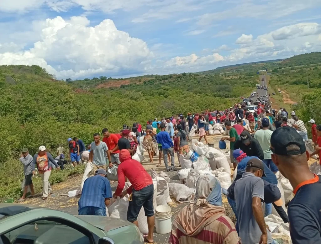 O acidente chamou a atenção de moradores da região e de motoristas que passavam pelo trecho. A carga foi liberada e rapidamente um grande número de pessoas se aglomerou no local para recolher a carga.