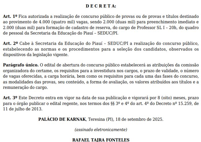 O Governo do Estado do Piauí autorizou concurso público com 4 mil vagas para professor da Secretaria de Educação do Piauí (Seduc). O decreto foi publicado na terça-feira (23) no Diário Oficial do Estado.