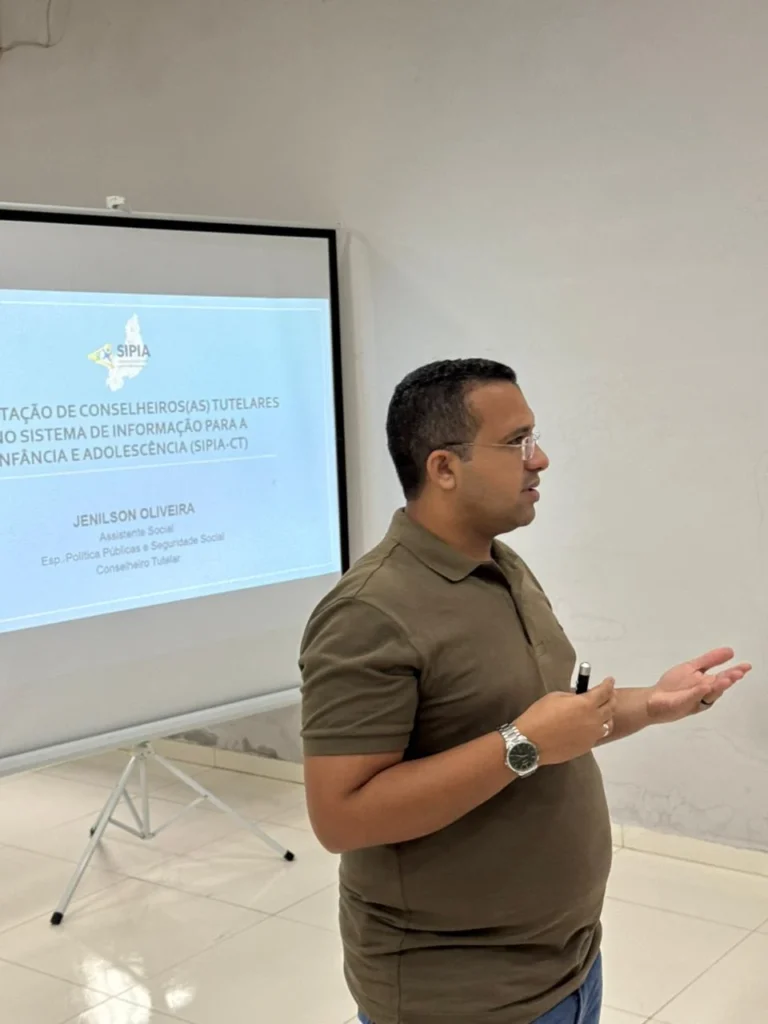A capacitação é conduzida pelo facilitador, Jenilson Oliveira, que compartilha orientações práticas sobre a utilização do sistema e a importância da correta alimentação das informações para o fortalecimento das políticas públicas voltadas à infância e juventude.