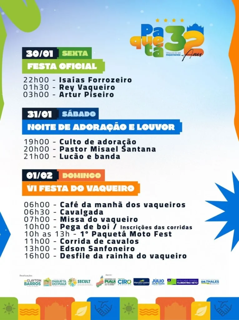 A Prefeitura de Paquetá do Piauí dá início, nesta sexta-feira, 30 de janeiro, à programação em comemoração aos seus 32 anos de emancipação política. A abertura oficial da festa acontece no Balneário Francisco Henrique de Holanda e promete reunir grande público, tendo como principal atração da noite o cantor Rey Vaqueiro.
