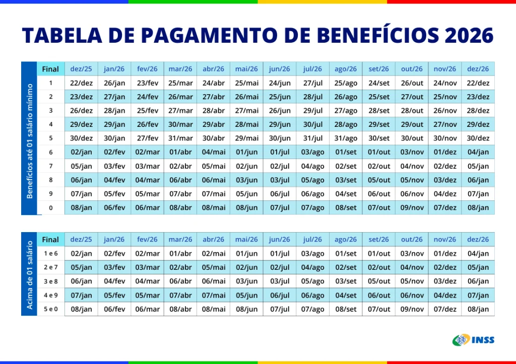 O Instituto Nacional do Seguro Social (INSS) divulgou, na quarta-feira (17), o calendário de pagamentos de 2026. Os valores atendem aposentados e pensionistas, além de segurados de outros benefícios, como auxílio-doença, auxílio-maternidade e auxílio-reclusão.