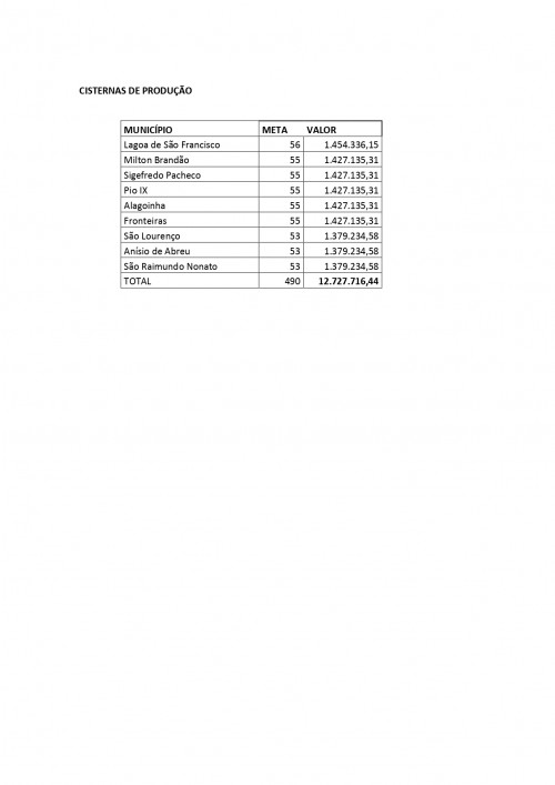 Para o estado do Piauí está prevista a implementação de 6.690 cisternas, sendo 6.200 de 1ª água (para o consumo humano) e 490 de 2ª água (produção de alimentos), o que representa um investimento total de R$ 51,4 milhões.