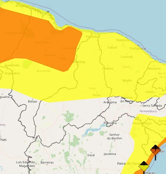 Entre os municípios sob alerta estão Teresina, Barras, Campo Maior, Esperantina, Floriano, Luís Correia, Parnaíba, Pedro II, Picos, Piracuruca, Piripiri e Uruçuí.