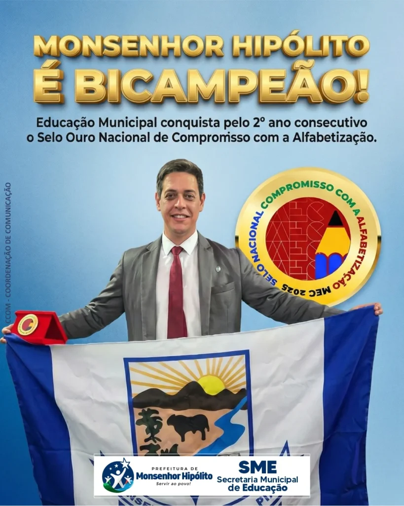 Pelo segundo ano seguido, a rede municipal de ensino de Monsenhor Hipólito alcança um marco histórico na educação. O município sob a gestão do prefeito Djalma Policarpo foi agraciado com o Selo Ouro Nacional de Compromisso com a Alfabetização, um reconhecimento do Ministério da Educação (MEC) que atesta a qualidade das políticas públicas voltadas à alfabetização na idade certa.