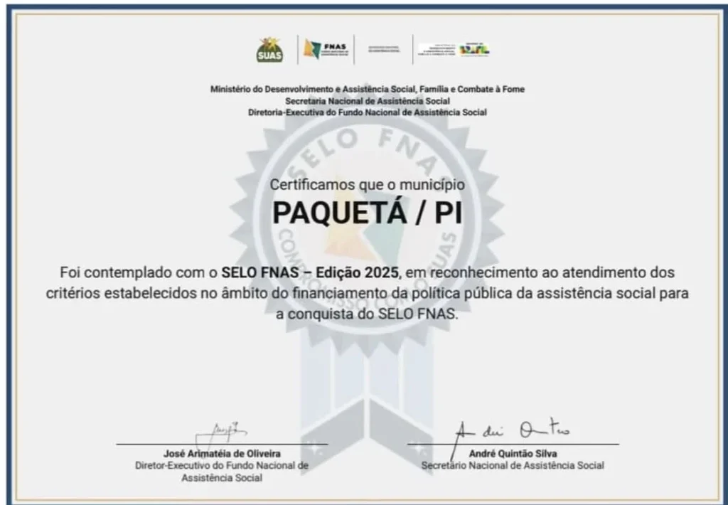 O município de Paquetá do Piauí foi contemplado com o Selo FNAS – Edição 2025, reconhecimento concedido pelo Fundo Nacional de Assistência Social a cidades que se destacam na gestão e no financiamento da política pública de assistência social. O resultado foi divulgado nessa sexta-feira (27).