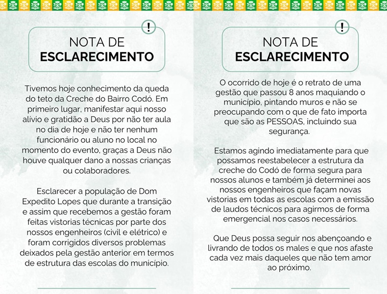 “Nossa equipe de engenharia, nosso engenheiro está lá desde cedo para poder identificar realmente o que houve e já determinamos também que sejam feitas novas vistorias técnicas em todas as escolas inicialmente e depois nos demais prédios públicos para poder tranquilizar a população em Dom Expedito com relação à segurança das pessoas”, finalizou.