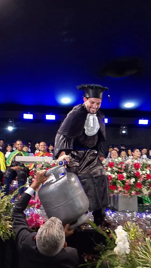O engenheiro civil Hélio Neto, natural de Brasileira (PI), ganhou destaque ao entrar na cerimônia de formatura carregando um botijão de gás, gesto que simbolizou a trajetória de trabalho até a conclusão do curso superior. Em entrevista concedida ao portal MeioNews, ele relatou os desafios enfrentados ao longo da graduação e o significado do ato que marcou a solenidade.