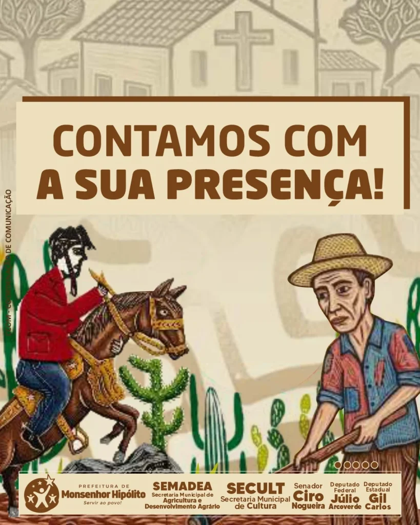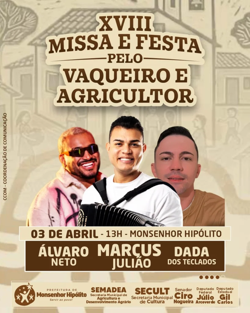 A Prefeitura de Monsenhor Hipólito, através do prefeito Djalma Policarpo anunciou nesta segunda-feira (27) a programação oficial da XVIII Festa e Missa pelo Vaqueiro e Agricultor de Monsenhor Hipólito, o evento que já é tradição no município é uma realização da gestão Djalma Policarpo meio das secretarias municipais de Cultura e Desenvolvimento Agrário, com apoio do senador Ciro Nogueira e dos deputados Júlio Arcoverde e Gil Carlos.