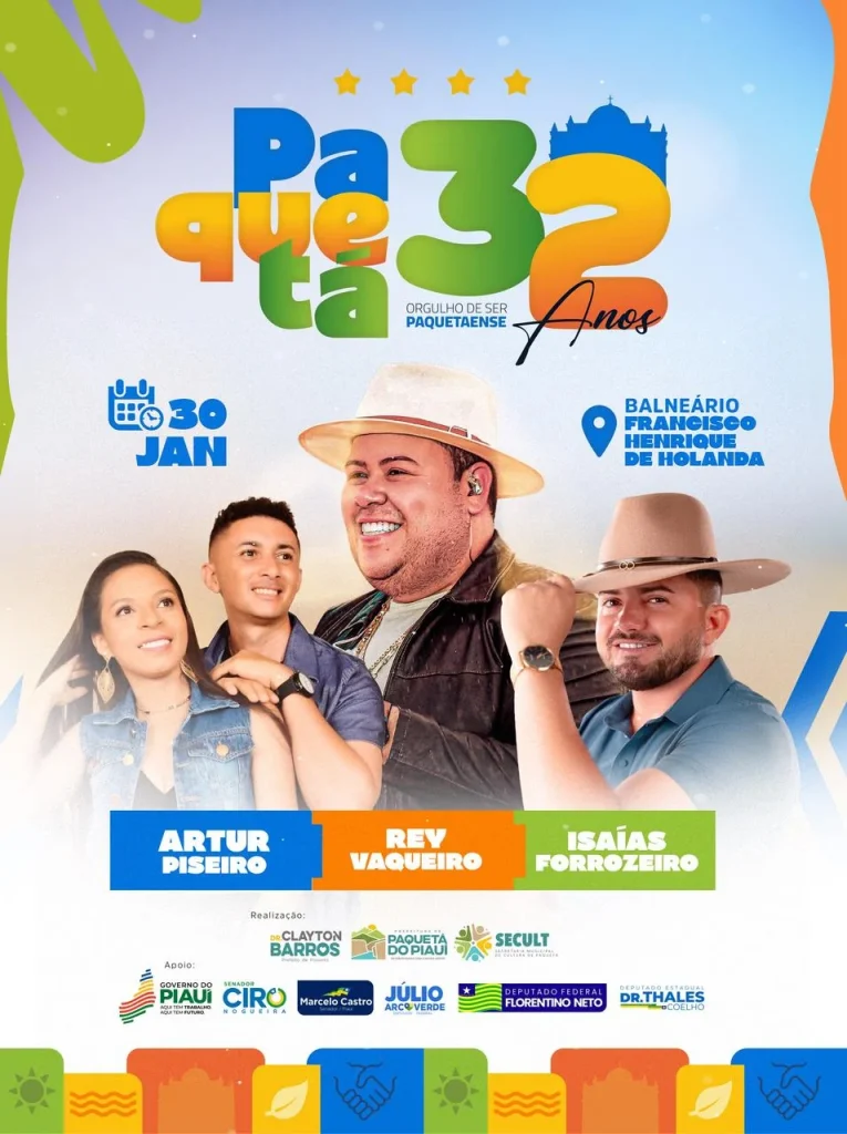 O município de Paquetá do Piauí se prepara para celebrar em grande estilo seu 32° aniversário de emancipação política e administrativa. A programação especial, que promete agitar a cidade e região está marcada para acontecer de 30 de janeiro a 1º de fevereiro, com shows e a tradicional Festa do Vaqueiro.