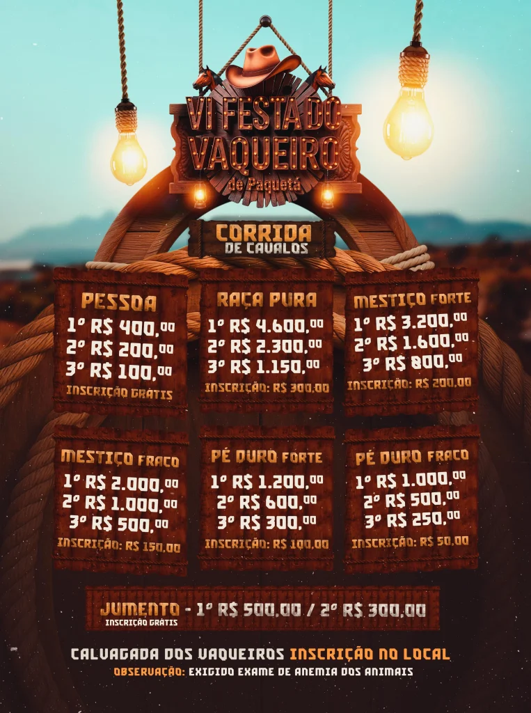 O encerramento das festividades acontece no domingo, 1º de fevereiro, no Haras Tamarindo, a partir das 13h, com a tradicional VI Festa do Vaqueiro, que nesta edição traz uma premiação total de R$ 24 mil reais, disputada pelos competidores das corridas em suas categorias.
