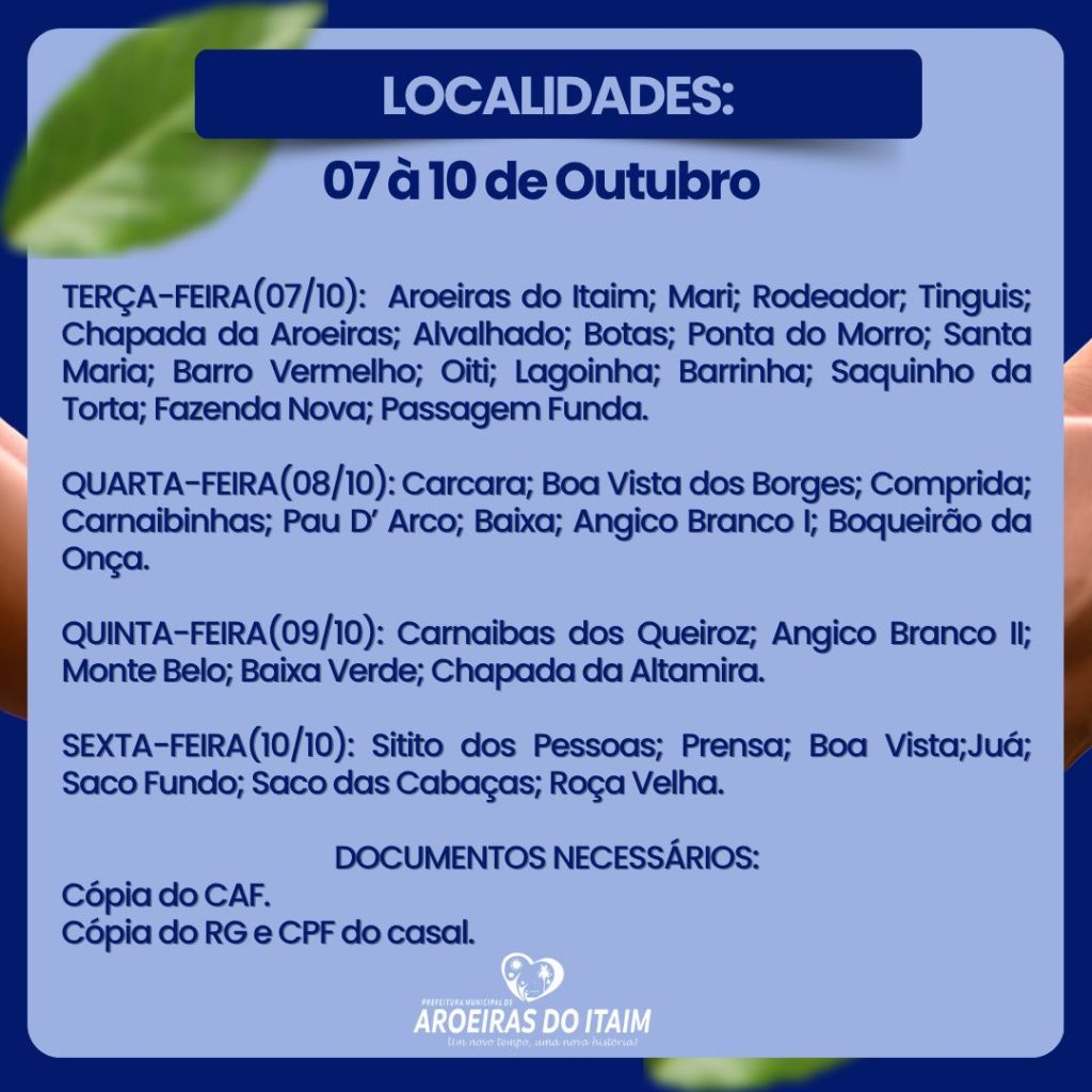 A Prefeitura Municipal de Aroeiras do Itaim, por meio da Secretaria de Agricultura, informa que estão abertas, entre os dias 07 e 10 de outubro, as inscrições para o Programa Garantia-Safra 2025/2026. O cadastramento está sendo realizado no Sindicato dos Trabalhadores Rurais, no horário das 8h às 13h.