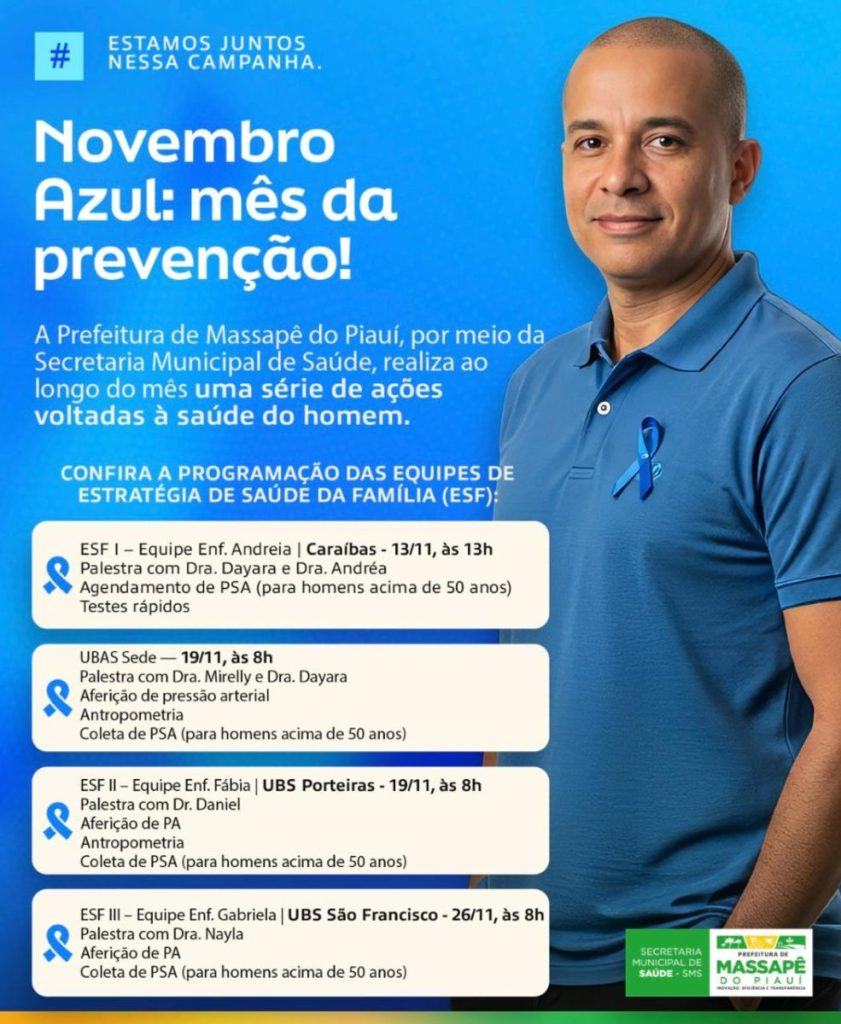 A Prefeitura de Massapê do Piauí, por meio da Secretaria Municipal de Saúde e total apoio do prefeito Wilton Coutinho, inicia nesta quinta-feira, 13 de novembro, às atividades da campanha Novembro Azul, mês dedicado à prevenção e aos cuidados com a saúde do homem. Durante todo o mês, serão realizadas diversas ações nas unidades de Estratégia de Saúde da Família (ESF) do município.