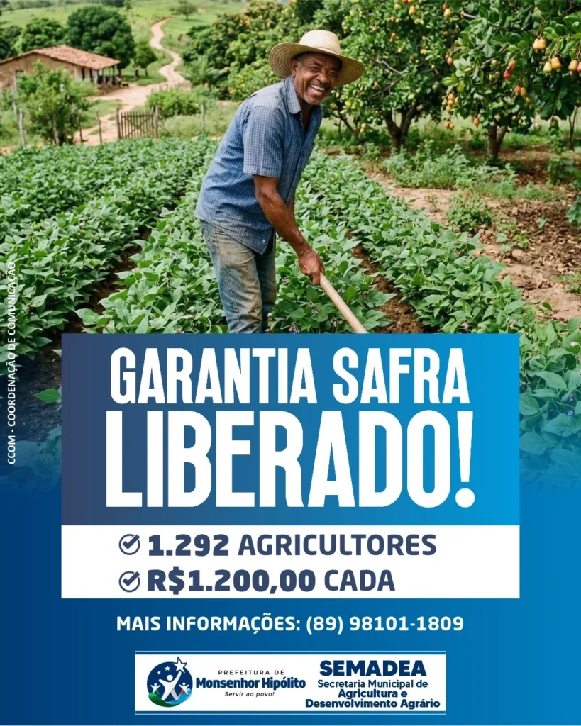 A Prefeitura de Monsenhor Hipólito através do prefeito Djalma Policarpo, anunciou nesta quarta-feira (18), a liberação de parcela do programa Garantia Safra para os agricultores familiares do município.