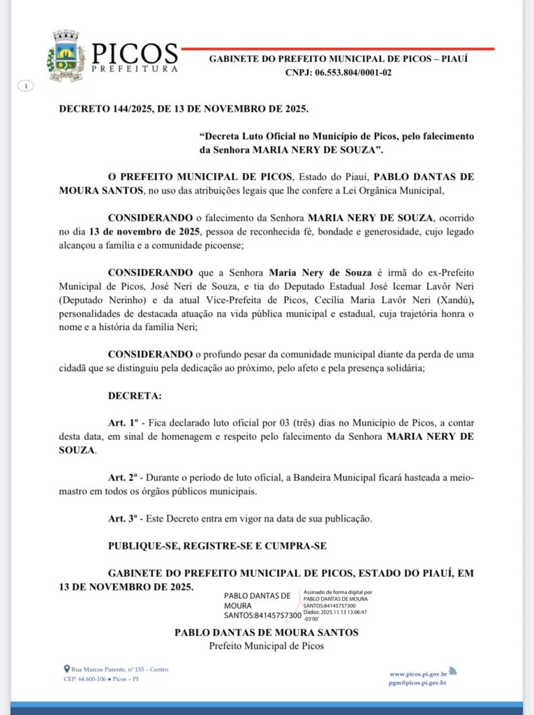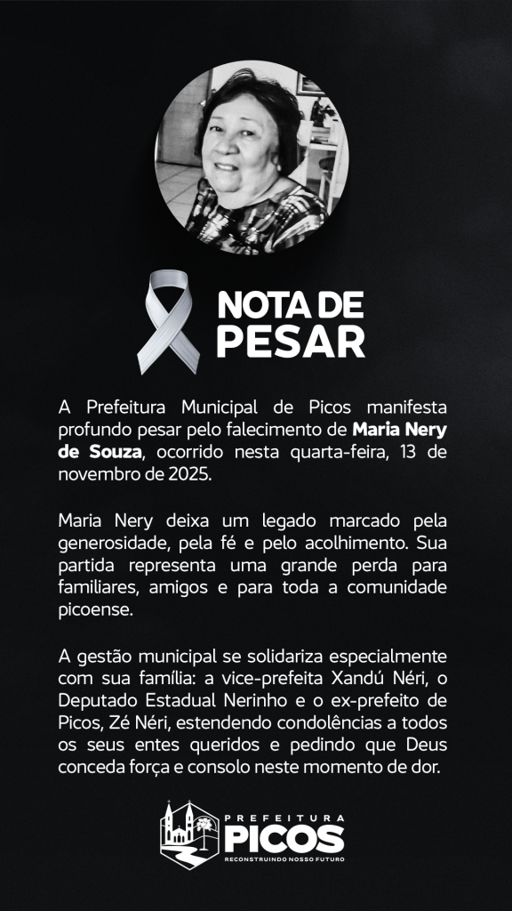 A Prefeitura Municipal de Picos decretou luto oficial de três dias pelo falecimento de Maria Nery de Souza, ocorrido nesta quinta-feira, 13 de novembro de 2025.