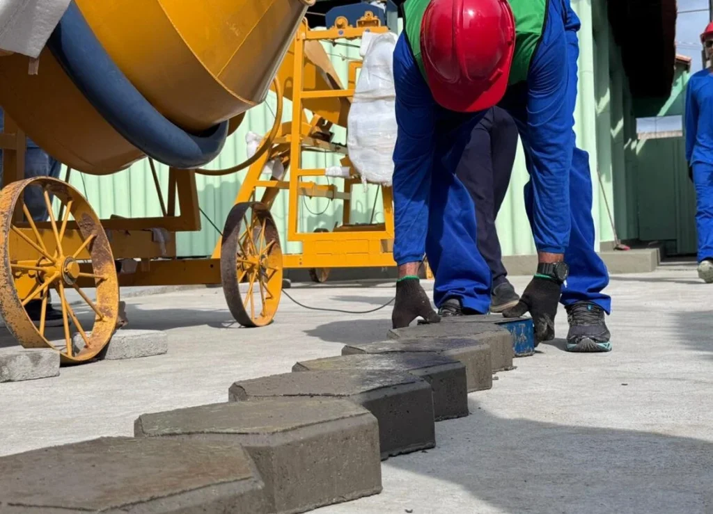 Os internos da unidade realizam um curso de qualificação profissional para produzir os blocos de concreto, ofertado pelo Serviço Nacional de Aprendizagem Industrial (Senai).