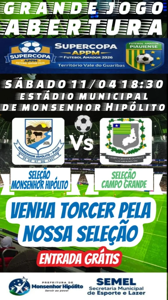 Acontece no próximo sábado (11), no Estádio Municipal de Monsenhor Hipólito a partir das 18h30, a partida de abertura da Supercopa APPM 2026. A seleção de Monsenhor Hipólito irá enfrentar o time de Campo Grande do Piauí em confronto que promete movimentar torcedores e atletas, marcando o início de uma das maiores competições do futebol amador do estado.