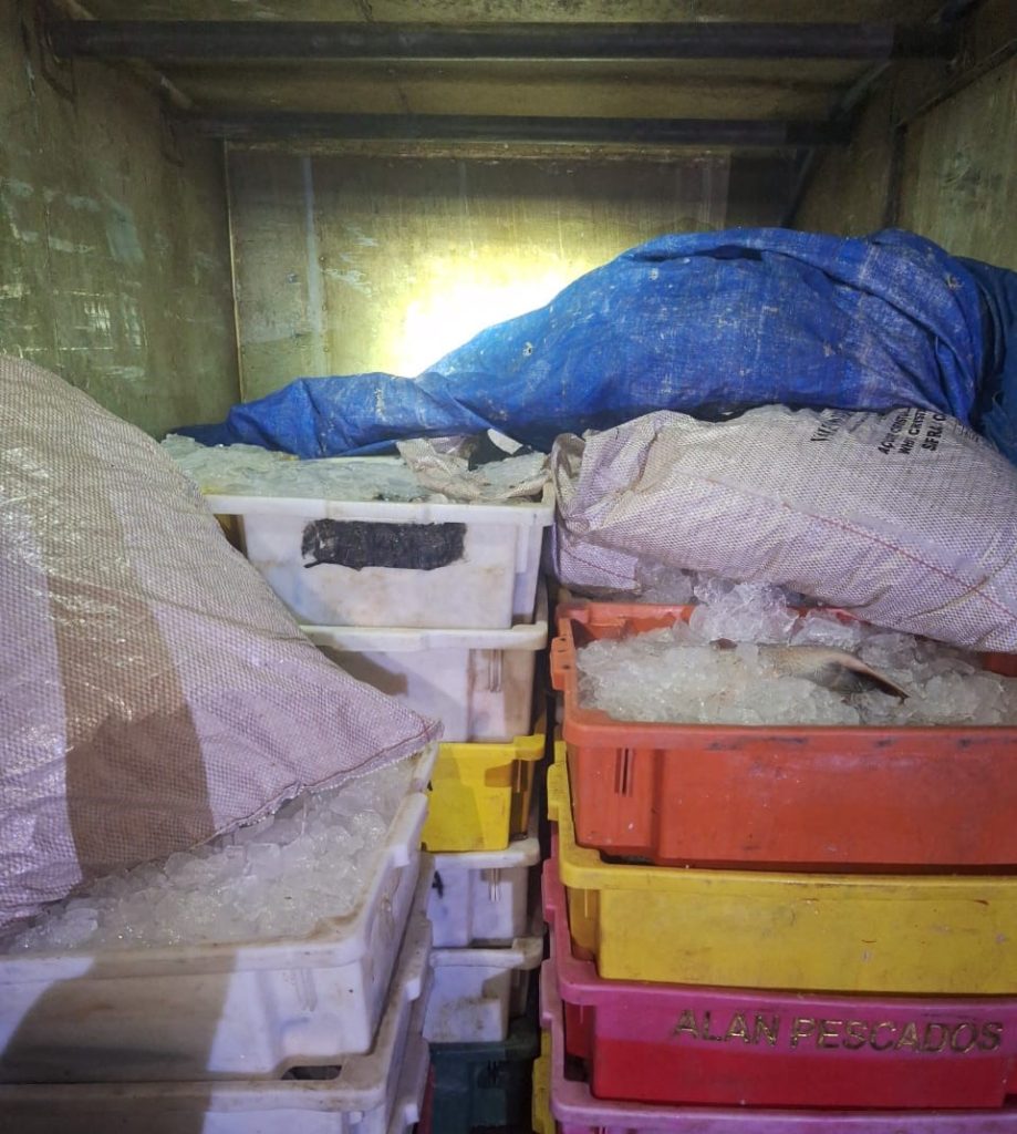 Durante a vistoria, os policiais confirmaram que o veículo transportava uma grande quantidade de pescado das espécies tambaqui e panga, sem documentação de origem, inspeção sanitária ou autorização dos órgãos competentes.